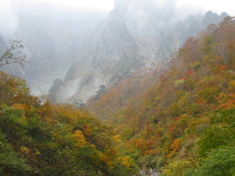一ノ倉沢 雨模様の一ノ倉沢でしたが見た時にはみんなで歓声を上げました。 壁の中ほどに万年雪が残っていました。 槍ヶ岳.穂高そしてここがロッククライマーにとって三大壁とのこと。 しかし、この山の魅力が数多くの人を飲み込んでいる厳しい現実がある。